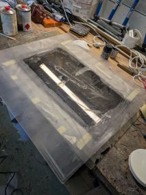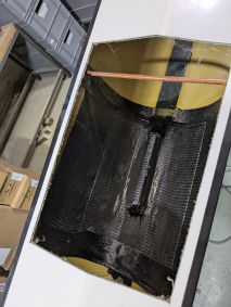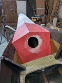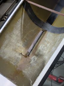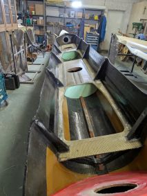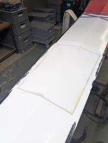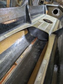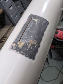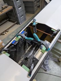Die Einstiege wiesen einige Beschädigungen auf und auch noch kein Schott auf. Also wieder einmal Kitten und Schleifen und dann fertigte ich aus 3 mm Schaumplatten, welche ich mit Carbon laminierte, Platten an welche als Schott eingepasst wurden. Wieder einmal kam West System und Additiv 403 plus schwarze Pigmente in einer 50 ml Spitze zum Einsatz. So konnte ich beim Übergang zum Rumpf einen schönen Abschluss herstellen.