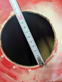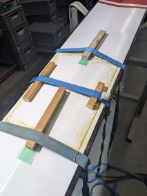 Und los ging’s! Erst mal alles raus aus dem Boot. Ausschleifen des beschädigten Rumpfes und stabilisieren des Schwerthauses mit Spreizen. Mit West System und Additiv 403 wurden der Rumpf gespachtelt, sodass dieser nach dem Aushärten auch ohne die Spreizen in Form blieb. Nun fertigte ich aus Plexiglas einen Platzhalter für das Schwert an und laminierte die Innenseite des Rumpfes mit Kohlefaser aus. Anschließend wurde das Schwerthaus mit Harz ausgegossen und das Ersatzschwert platziert. Kleine Lamellen wurden platziert, damit das Verdeck wieder geschlossen werden konnte. Schleif- und Spachtelarbeit verliehen dem Verdeck und Rumpf wieder die richtige Form.
