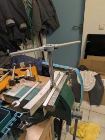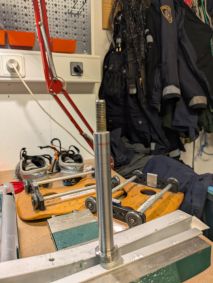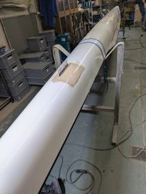 Die Ausleger wurden einstweilen zum Glaskugelstrahlen verbracht. Die Dollenstifte überschliffen, polliert, Gewinde nachgeschnitten und anschließen ausgerichtet. Neue Dollen wurden von Max Schellenbacher besorgt, ebenso wie die Alu Stemmbrettschienen, Schuhe, Rollschienen, Schienenkeile, Luftkastendeckel und zwei neue Carbonrollsitze.